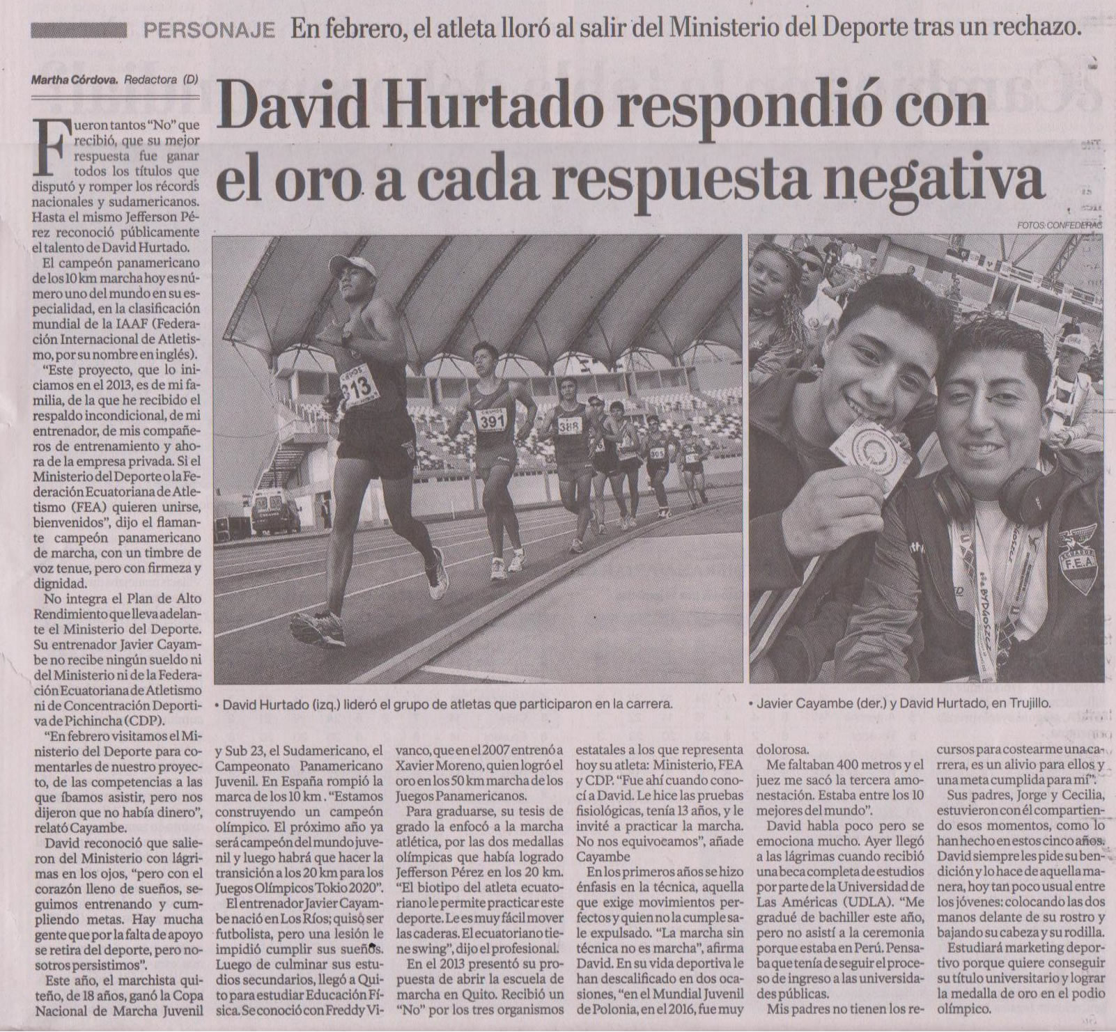 Fueron tantos “No” que recibió, que su mejor respuesta fue ganar todos los títulos que disputó y romper los récords nacionales y sudamericanos. Hasta el mismo Jefferson Pérez reconoció públicamente el talento de David Hurtado. El campeón panamericano de los 10 km marcha hoy es número uno del mundo en su especialidad, en la clasificación mundial de la IAAF (Federación Internacional de Atletismo, por su nombre en inglés). No integra el Plan de Alto Rendimiento que lleva adelante el Ministerio del Deporte. Su entrenador Javier Cayambe no recibe ningún sueldo ni del Ministerio, ni de la Federación Ecuatoriana de Atletismo, ni de Concentración Deportiva de Pichincha (CDP). “En febrero visitamos el Ministerio del Deporte para comentarles de nuestro proyecto, de las competencias a las que íbamos asistir, pero nos dijeron que no había dinero”, relató Cayambe. Este año, el marchista quiteño, de 18 años, ganó la Copa Nacional de Marcha Juvenil y Sub 23, el Sudamericano, el Campeonato Panamericano Juvenil. En España rompió la marca de los 10 km . “Estamos construyendo un campeón olímpico. El próximo año ya será campeón del mundo juvenil y luego habrá que hacer la transición a los 20 km para los Juegos Olímpicos Tokio 2020”. “La marcha sin técnica no es marcha”, afirma David. En su vida deportiva le han descalificado en dos ocasiones, “en el Mundial Juvenil de Polonia, en el 2016, fue muy dolorosa. Me faltaban 400 metros y el juez me sacó la tercera amonestación. Estaba entre los 10 mejores del mundo”. David habla poco pero se emociona mucho. Ayer llegó a las lágrimas cuando recibió una beca completa de estudios por parte de la Universidad de Las Américas UDLA. “Me gradué de bachiller este año, pero no asistí a la ceremonia porque estaba en Perú. Pensaba que tenía de seguir el proceso de ingreso a las universidades públicas. Mis padres no tienen los recursos para costearme una carrera, es un alivio para ellos y una meta cumplida para mí”.