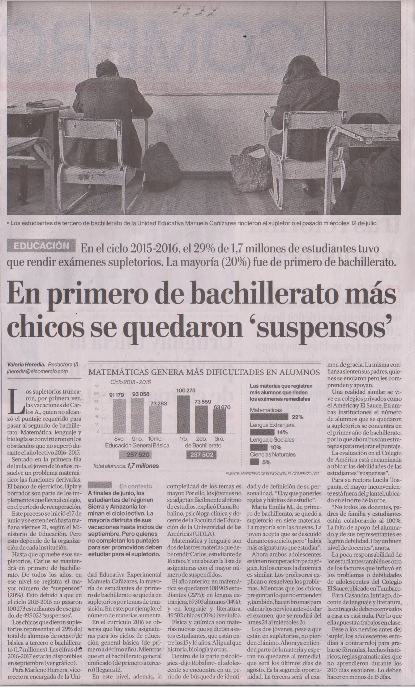 Los supletorios truncaron, por primera vez, las vacaciones de Carlos A., quien no alcanzó el puntaje requerido para pasar al segundo de bachillerato. Matemática, lenguaje y biología se convirtieron en los obstáculos que no superó durante el año lectivo 2016- 2017. Este proceso se inició el 7 de junio y se extenderá hasta mañana, viernes 21 de julio del 2017, según el Ministerio de Educación. Pero esto depende de la organización de cada institución. Hasta que apruebe esos supletorios, Carlos se mantendrá en primero de bachillerato. De todos los años, en ese nivel se registra el mayor número de “suspensos” (20%). Esto debido a que en el ciclo 2015-2016 no pasaron 100 273 estudiantes de ese grado, de 495 022 ‘suspensos’. En el currículo 2016 se observa que hay siete asignaturas para los ciclos de educación general básica (de primero a décimo año). Mientras que en el bachillerato general unificado (de primero a tercero) llegan a 12. En este nivel, además, la complejidad de los temas es mayor. Por ello, los jóvenes no se adaptan fácilmente al ritmo de estudios, explicó Diana Robalino, psicóloga clínica y docente de la Escuela de Educación de la Universidad de Las Américas UDLA. Matemática y Lenguaje son dos de las tres materias que debe rendir Carlos, estudiante de 16 años. Y encabezan la lista de asignaturas con el mayor número de suspendidos.