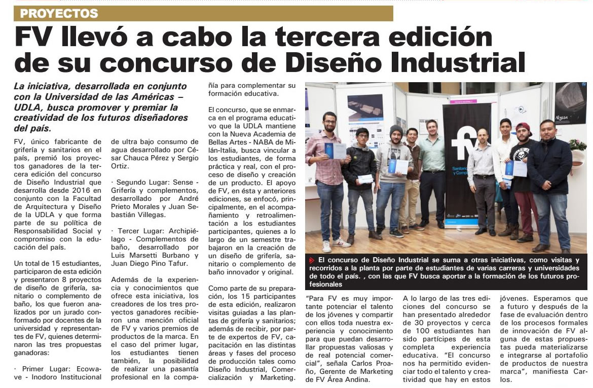 FV, único fabricante de grifería y sanitarios en el país, premió los proyectos ganadores de la tercera edición del concurso de Diseño Industrial que desarrolla desde el 2016 en conjunto con la Facultad de Arquitectura y Diseño de la UDLA y que forma parte de su política de Responsabilidad Social.