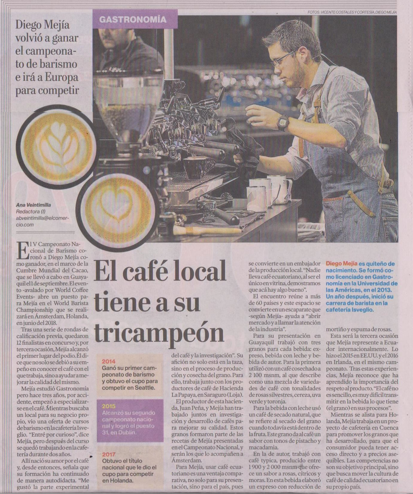 El V campeonato Nacional de Barismo coronó a Diego Mejía como ganador en el marco de la Cumbre Mundial del Cacao, que se llevó a cabo en Guayaquil el 1 de septiembre. Diego Mejía es quiteño de nacimiento. Se formó como licenciado en Gastronomía en la Universidad de Las Américas, en el 2013.