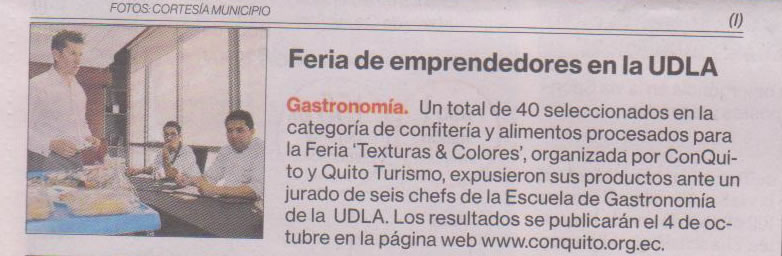 Un total de 40 seleccionados en la categoría de confitería y alimentos procesados para la Feria “Texturas & Colores”, organizada por ConQuito y Quito Turismo, expusieron sus productos ante un jurado de seis chefs de la Escuela de Gastronomía de la UDLA.