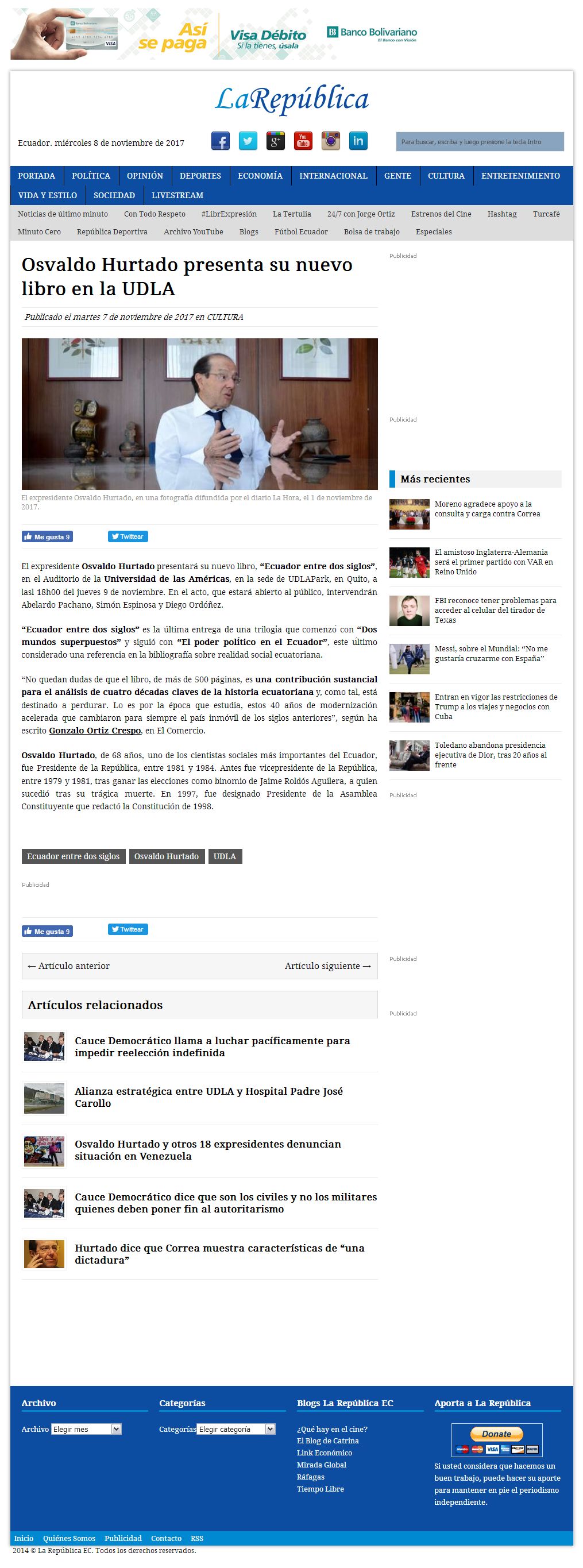 El expresidente, Osvaldo Hurtado, presentará su nuevo libro, “Ecuador entre dos siglos”, en el Auditorio de la Universidad de Las Américas, en la sede de UDLA Park, en Quito, a las 18h00, del jueves 9 de noviembre. En el acto, que estará abierto al público, intervendrán Abelardo Pachano, Simón Espinosa y Diego Ordóñez. “Ecuador entre dos siglos” es la última entrega de una trilogía que comenzó con “Dos mundos superpuestos” y siguió con “El poder político en el Ecuador”, este ultimo considerado una referencia en la bibliografía sobre realidad social ecuatoriana.