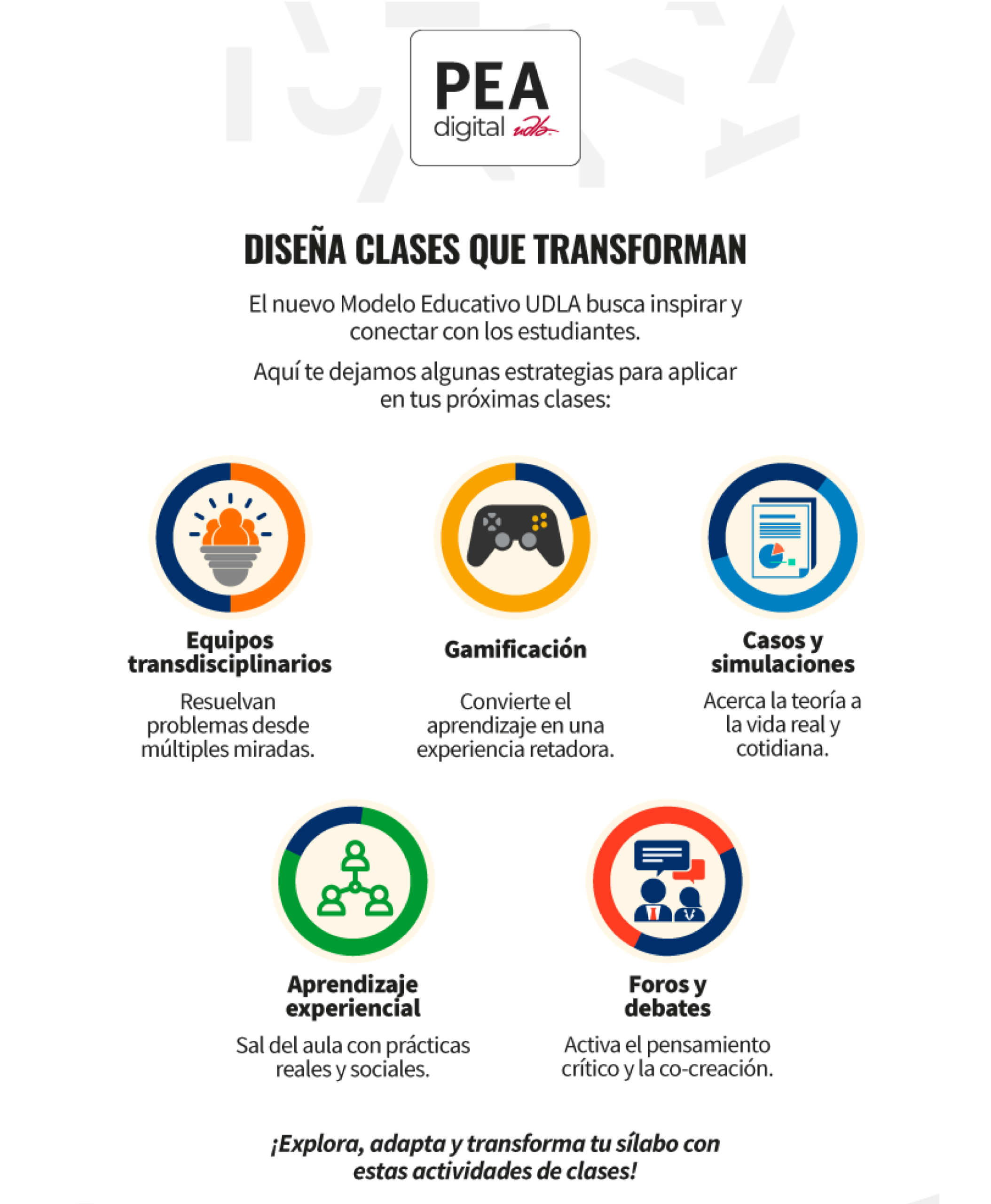 Accede a videos y tutoriales que te brindarán estrategias, metodologías y herramientas para enriquecer la enseñanza y evaluación en la UDLA.